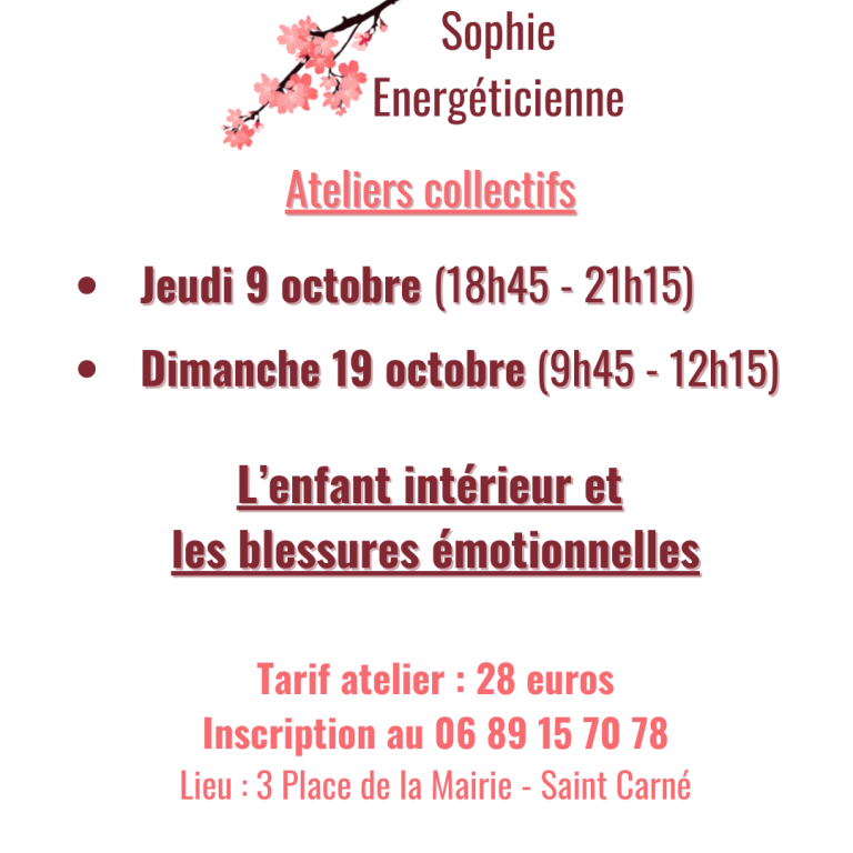 Voici les dates des ateliers collectifs proposés en octobre sur le thème de l'enfant intérieur et les blessures émotionnelles.Chaque atelier est un moment de...